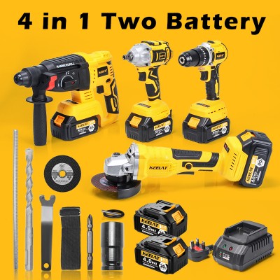 KEELAT四合一无刷无绳冲击扳手冲击钻旋转锤钻角磨机同电池一箱工具套装,带20V 4.0Ah锂离子电池